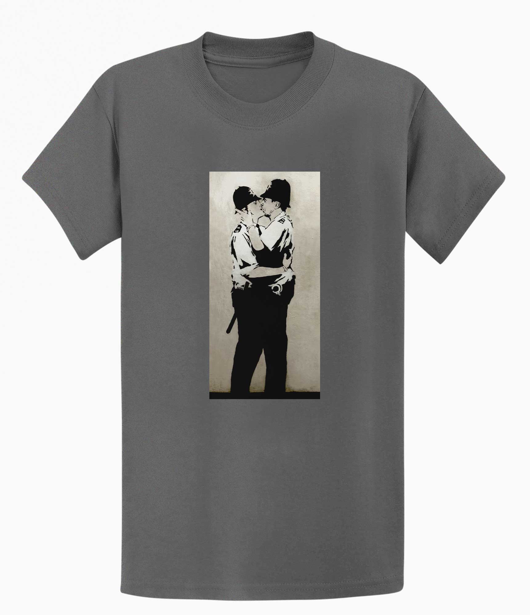 Grab yourself a piece of street art history with this 100% cotton Banksy T-Shirt. Featuring Banksy’s celebrated Kissing Coppers - which originally featured in Brighton in 2004 - displayed on a classic black background for maximum impact.