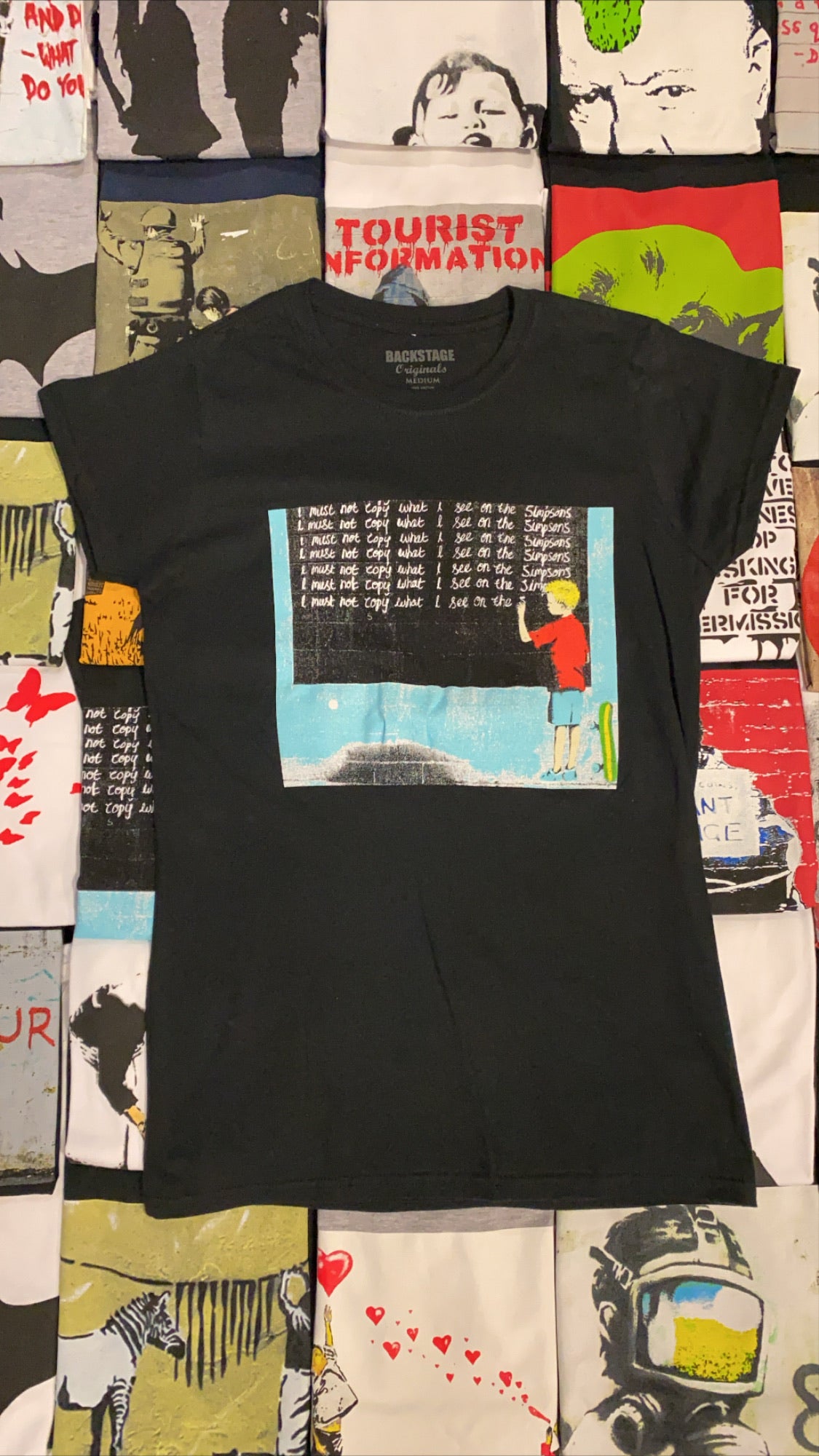 Grab yourself a piece of street art history with this women's Banksy T-Shirt. Featuring Banksy’s celebrated I Must Not Copy What I See on Simpsons artwork - which originally featured in New Orleans in 2008 - displayed on a classic black background for maximum impact.